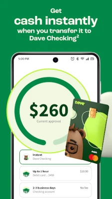 1-Dave is not a bank. Banking services provided by Evolve Bank and Trust, Member FDIC, or another partner bank, which issues the Dave Debit Card through a license from Mastercard®. ExtraCash amounts range from $25-$500, typically approved in 5 min, with an overdraft fee equal to the greater of $5 or 5%. Multiple overdrafts may be required. Not all members qualify for ExtraCash and few qualify for $500. ExtraCash is repayable on demand. Must open an ExtraCash overdraft deposit account and Dave Checking account. Up to $5 monthly membership fee for ExtraCash, Income Opportunity Services, and Financial Management Services. Optional 1.5% fee for external debit card transfers.